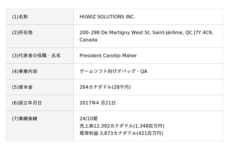 HUWIZは、カナダのモントリオール近郊に本拠地を構える、ゲームソフト向けのデバッグ・QAで高い評価を得ている企業です。これまで、地元カナダのスタジオで開発されたゲームだけではなく、欧米のゲームメーカーが開発する人気シリーズタイトル等の品質向上も支援してまいりました。モントリオールは、世界有数のゲーム開発都市の1つであり、HUWIZは、ゲーム開発に知見のある優秀な人材を確保しながら、様々な開発スタジオのデバッグ案件を獲得することで、2017年の創業以降、継続的に成長しております。