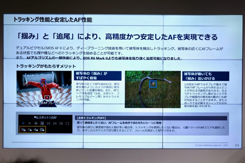 R6→R6 Mark IIの時は、劇的にAF性能が上がったが、今回の性能向上がどのぐらいなのかは試してみてから判断したいところ。『掴みが良くなっている』し、特定の人物を追尾することができるとのことなので、これも実際に使ってみると実感できる良さなのかもしれない。
