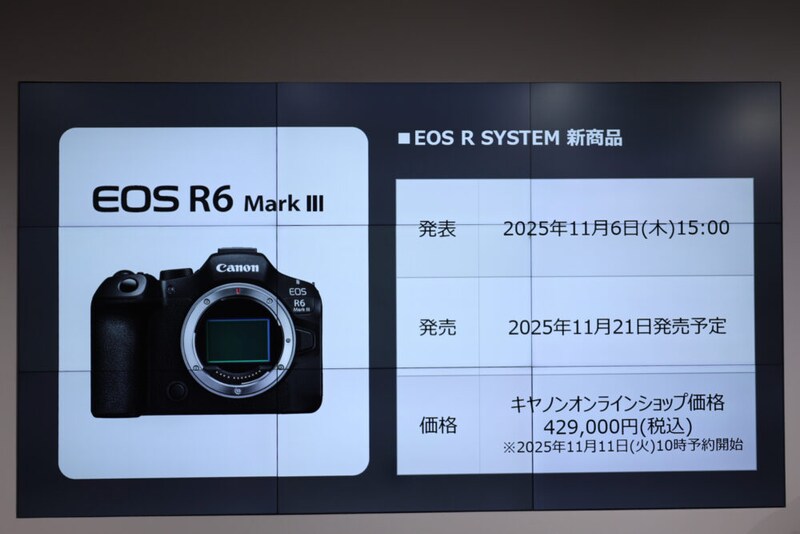 キヤノンがEOS R6 Mark IIIを発表。2020年のEOS R6から、2022年のEOS R6 Mark IIに続いて、わずか5年で第3世代へと進化した。最大の変更点は3,250万画素センサーの採用。発売は2025年11月21日。2025年11月11日10時予約開始。価格は、42万9000円。