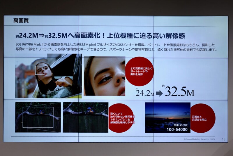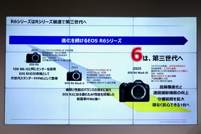 プロ向けフラッグシップのR1、R3、プロのサブ機、アマチュアのハイエンドのR5 Mark IIに続く、ハイアマチュア向け一眼カメラがR6シリーズで、ご覧のように2020年の登場以来、これで第3世代目ということになった。