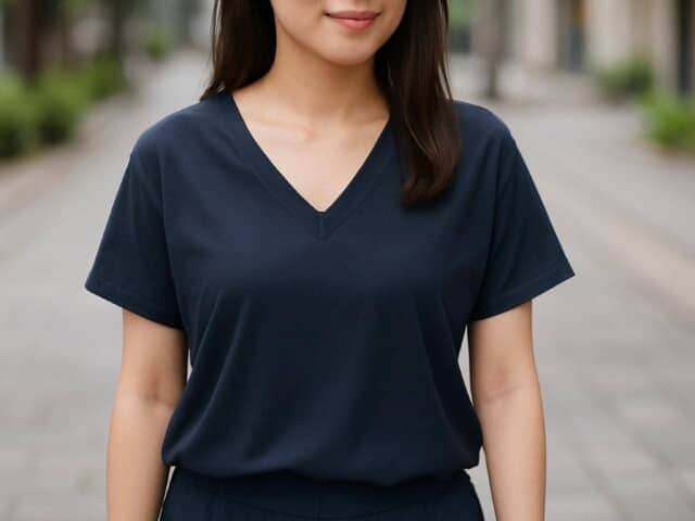 顔まわりをすっきり見せたいなら、まずはトップス選びから。詰まった首元は上半身を大きく見せやすいため、Vネックがおすすめ。デコルテが自然にのぞくことで抜け感が生まれ、顔もシャープに見えます。