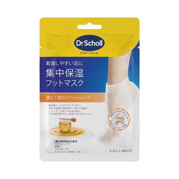 「ドクター・ショール 集中保湿フットマスク マヌカハニー」(550円)は、履くだけ20分でしっとりかかとに整える靴下型マスクです。