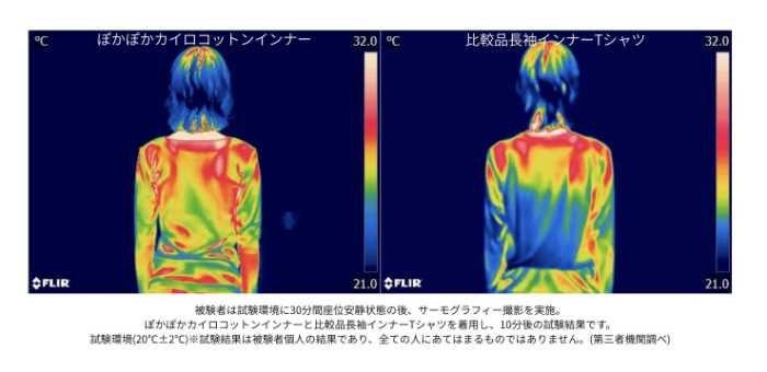 『ぽかぽかカイロコットンインナー』は、特殊技術によって綿本来の吸湿発熱性を高めた「HIGHHEAT®-COTTON」を採用。