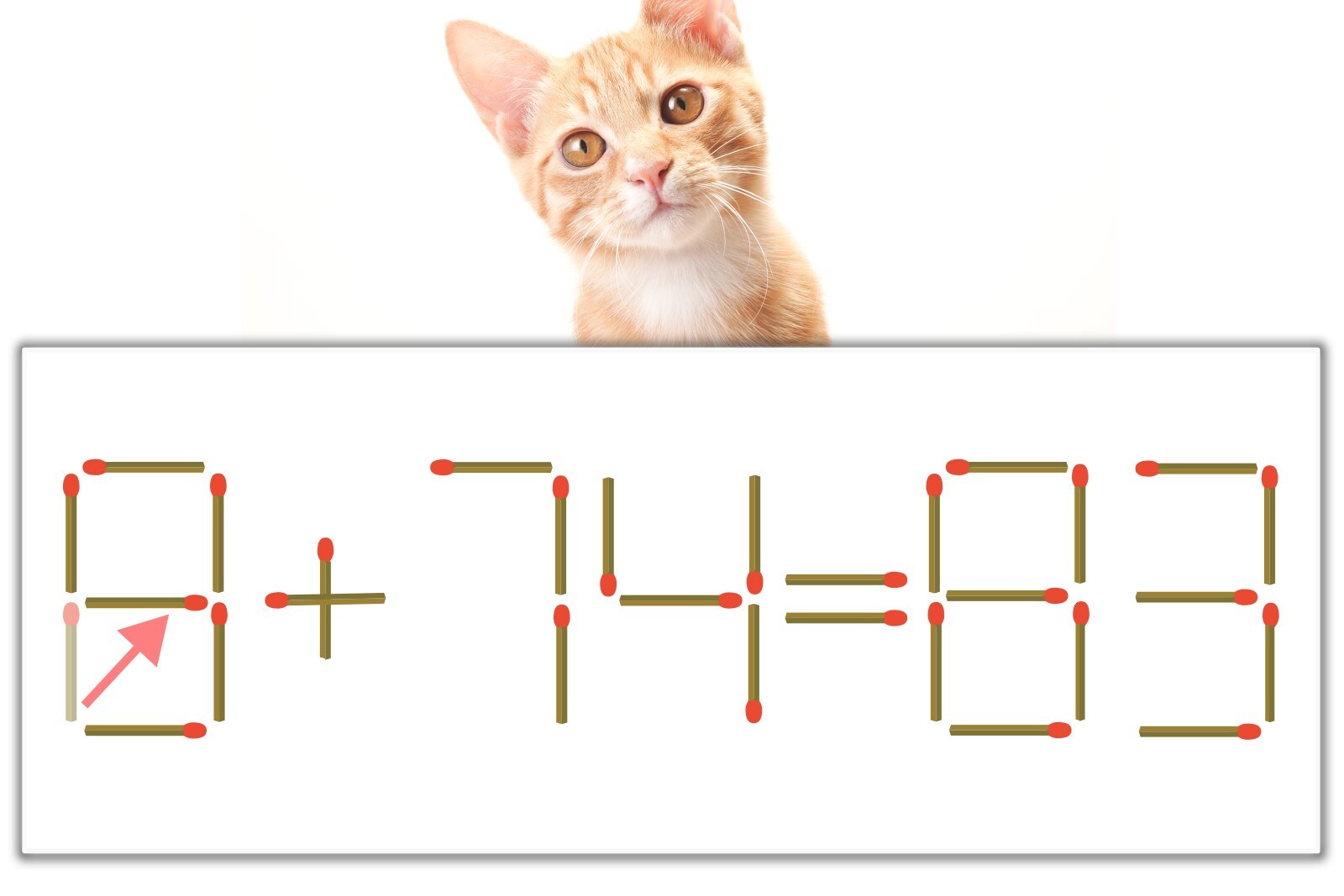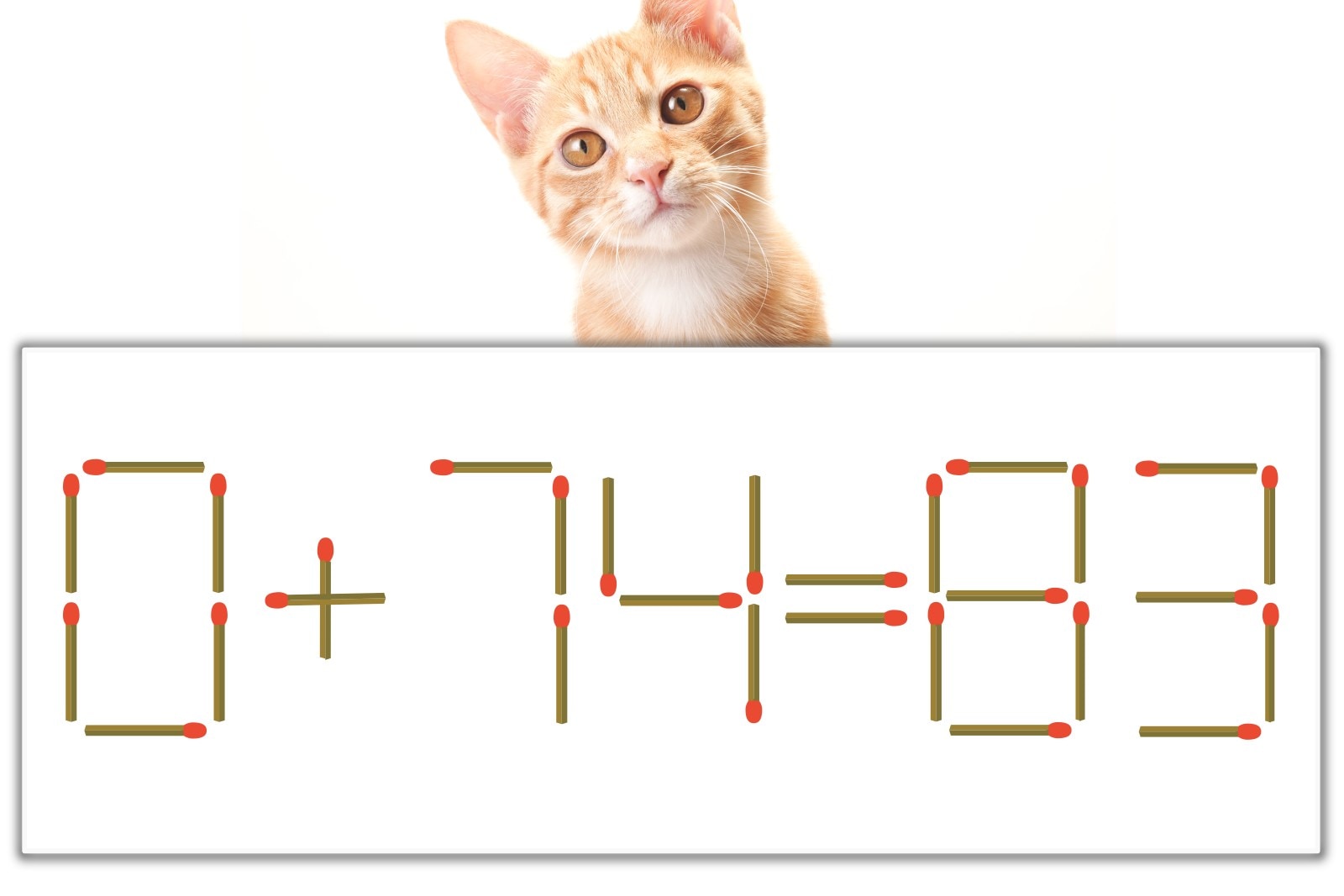 「0」のマッチ棒を1本、右上にスライドさせて「9」を作り、「9+74=83」にする。※解答は複数ある場合があります。