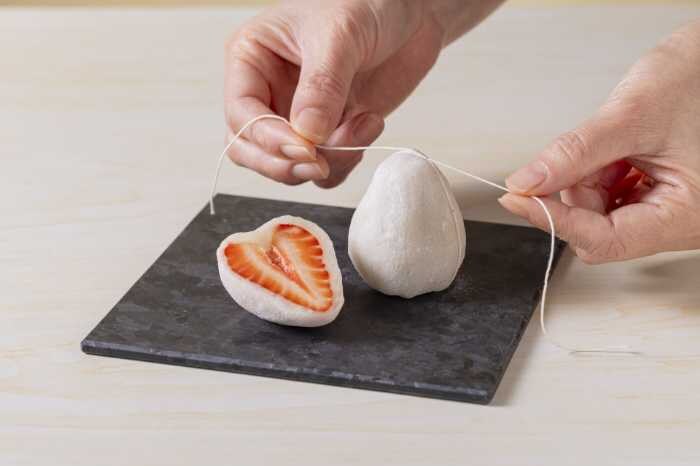偶然から生まれた“ハートいちご”を、今回は職人が本当にハート型になるよう丁寧にカットし、柔らかな求肥で包みました。