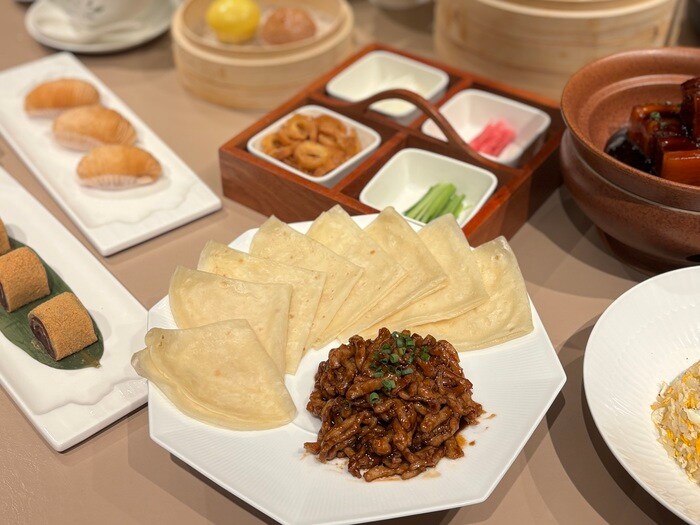 もちもちとしたクレープ生地に具材を包んでいただく「甘辛豚肉の細切り炒め クレープ包み」。細切りにされた甘辛な味わいの豚肉に、シャキシャキとしたきゅうりやネギ、カリッとした揚げパンがアクセントになっており、味わいと食感を楽しみながらいただけます。