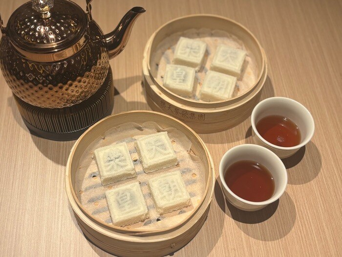 デザートには「オリジナル もち米の蒸しケーキ」真っ白な蒸しケーキには、楽天皇朝の文字(漢字は、パラダイスダイナステイのロゴ)かわいらしいロゴの入ったお菓子、もっちりふわふわ食感で、中には、甘さ控えめの小豆、温かいお茶と一緒にいただきました。