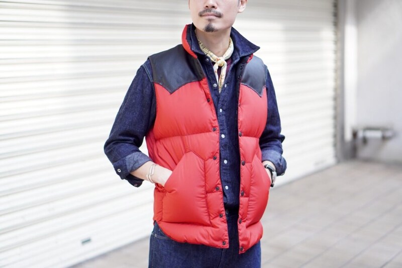 一枚裁ちのヨークレザーが象徴的な「ロッキーマウンテン フェザーベッド」を代表するダウンベスト。その表地と裏地の配色を「ヒノヤ」が別注した特別仕様。ダウンにはヨーロッパ産の撥水ダウンを採用。通常のダウンは水に弱いものの、ダウン自体に撥水加工を施すことで、悪天候下でも高い保温力を発揮する。7万400円/ロッキーマウンテン フェザーベッド×ヒノヤ(ヒノヤ ワンTEL03-3831-0385)