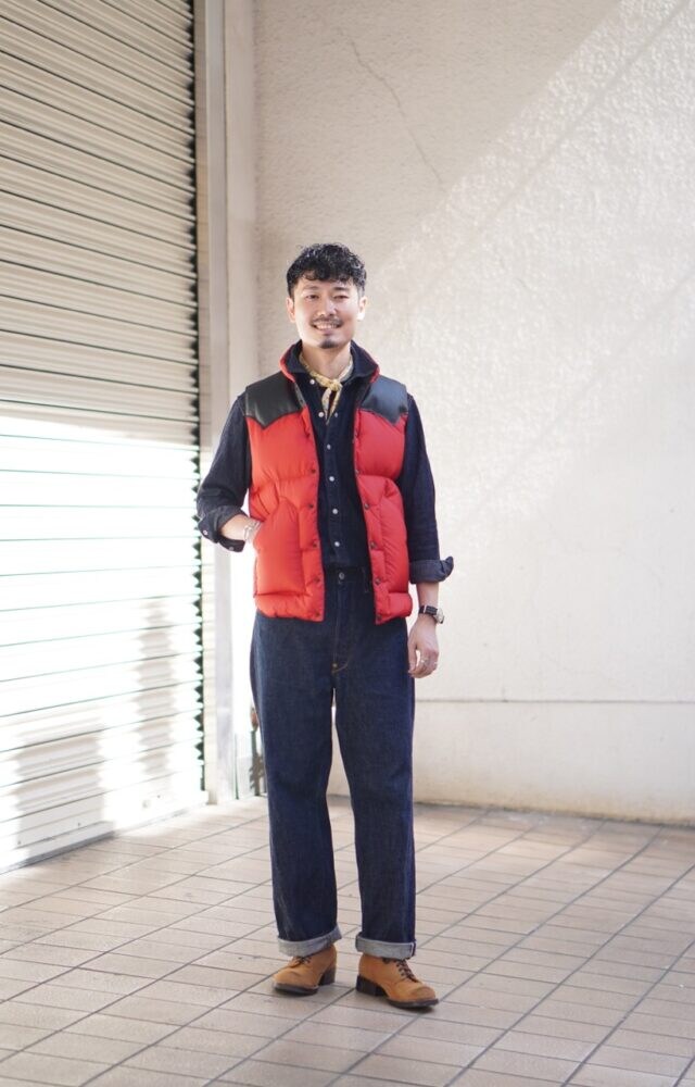 「ウエスタンシャツにレザーヨークのベスト、足元にはスウェードのブーツ。全体をウエスタンテイストでまとめつつ、デニムのセットアップで大人っぽく仕上げました。セットアップのシャツとパンツはブランドが異なり、生地や色味もわずかに違いますが、その“ほんの少しの違和感”のある組み合わせに、最近はハマっています。ネイビーで統一したスタイルに、主役となる赤のベストを差し色として効かせました。」