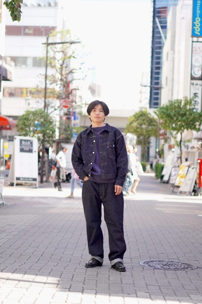 「ゆったりとしたシルエットが好きなので、デニムパンツはあえて大きめの36インチを選び、ベルトでギュッと絞って穿いています。スウェットもLサイズの少しゆったりめをチョイス。ネイビーで全体を統一し、同系色でまとめることで、ラフさの中にも落ち着きのある雰囲気にしてみました。パンツは裾にクッションを溜めるようにして穿き、リラックス感を大切にしたスタイリングです。」