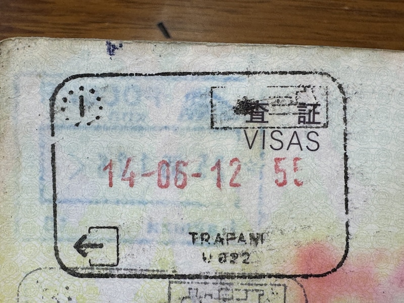 イタリアのトラパニから船で出国したのですが、その際、船がデザインされたスタンプが押されました。飛行機と鉄道が多いなかでの船、エモいです。