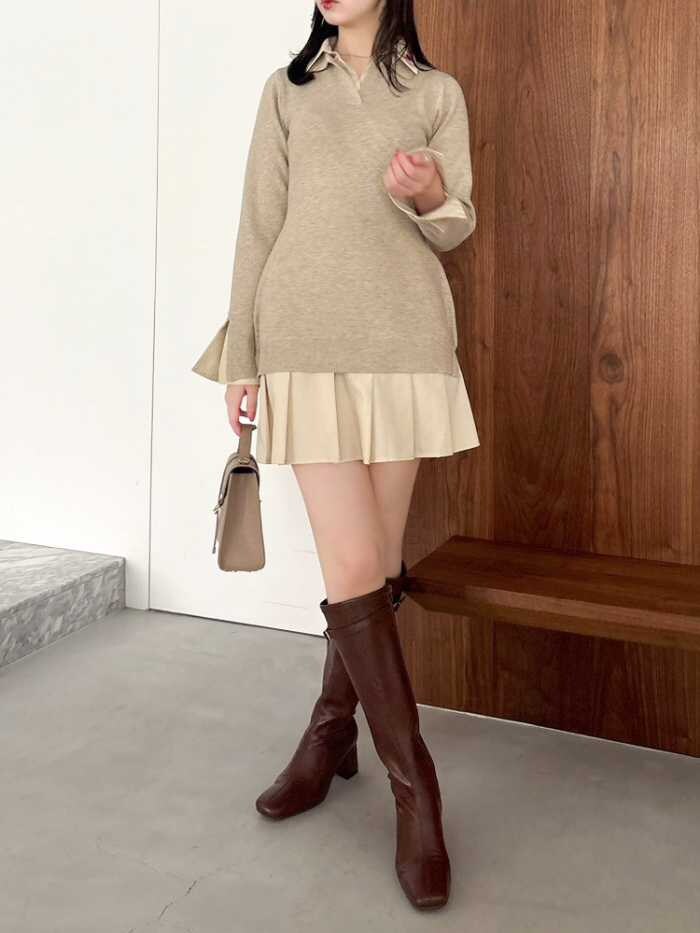 シャツレイヤードニットミニワンピース(14,300円税込)は、一枚でレイヤードコーデが完成する万能アイテム。グレー・ブラック・ピンク・ベージュの4色展開です。
