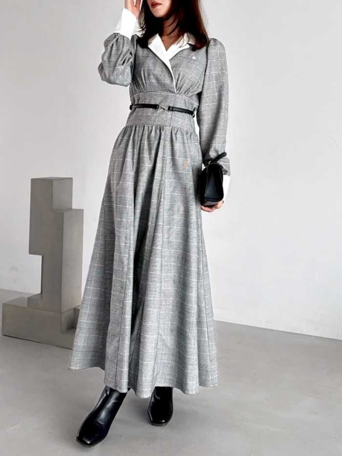 テーラーカラーフレアワンピース(16,500円税込)は、揺れるフレアシルエットと美しい襟元が印象的。グレー・ブラウン・アイボリーの3色展開で、シーンを選ばず着こなせます。