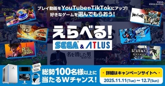 本キャンペーンでは、YouTube、TikTokで対象タイトルの体験版プレイ動画をアップし応募し、一定の視聴数を達成した方全員にセガ/アトラスタイトルのゲームコードをプレゼントするほか、Wチャンスとして達成者の中から抽選でゲーミングPCをはじめとした「最新配信ギア」を4名様、ギフトコードを100名様にプレゼントします。キャンペーンの詳細は、キャンペーンページをご確認ください。