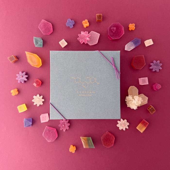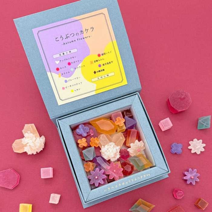 「こうぶつのカケラ〜Autumn Flowers〜」は、金木犀、コスモス、菊、ダリア、ケイトウなど秋を象徴する花々をイメージした琥珀糖。