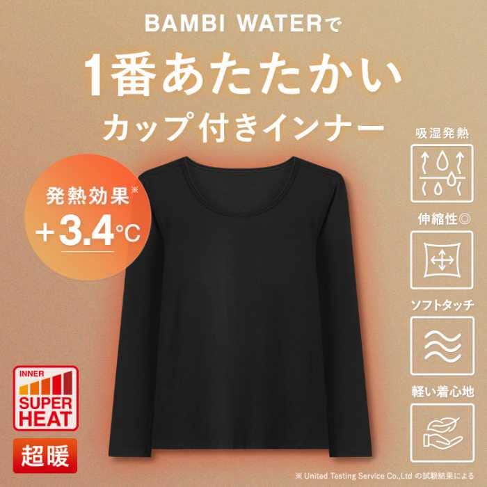 『バンビウォーター ブライン スーパーヒート インナー クルーネック』は、身体から発生する汗や湿気を吸収し、+3.4℃(*2)の吸湿発熱効果を発揮。
