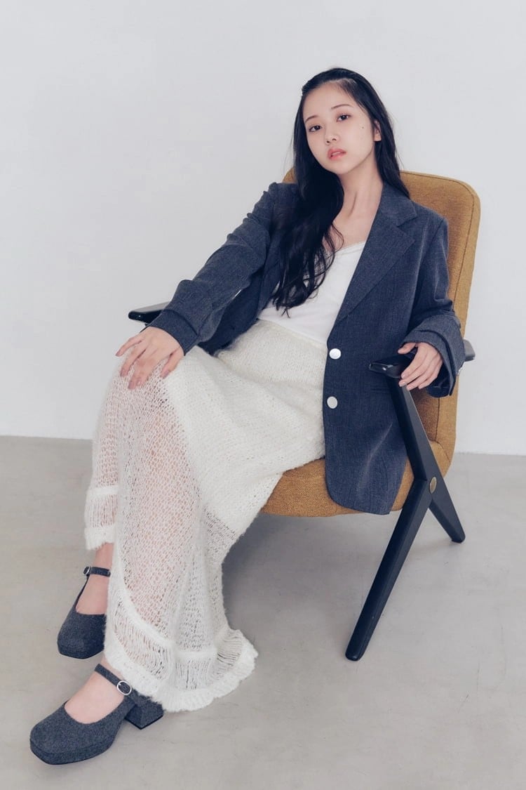 シックなジャケットに肌が透ける薄手のニットスカートで、レディに仕上げて。