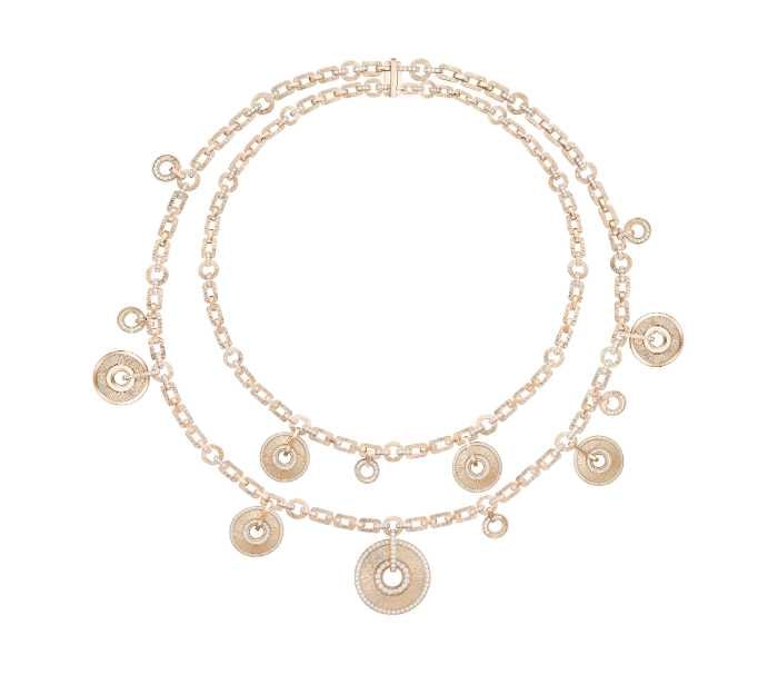 チェーンとフォルムの調和が生み出す優美な造形は、ピアジェのクラフツマンシップの真髄。まさに「黄金が呼吸するアートピース」と呼ぶにふさわしい逸品です。
