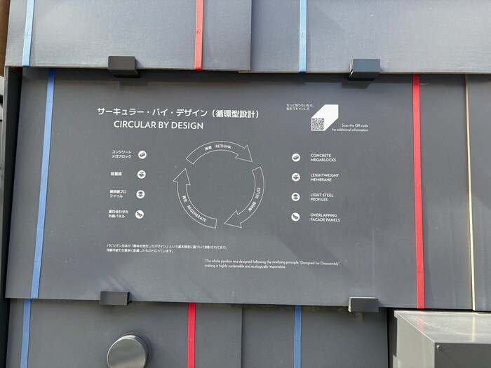 ルクセンブルクパビリオンは、「サーキュラー・バイ・デザイン(循環型経済の原則に従って、解体を念頭において設計)」を採用しており、コンクリートブロック・軽量網・軽鉄鋼プロファイルなどを使用し、パビリオンの建築部材の一部を再利用できるよう、当初から構想・設計されています。