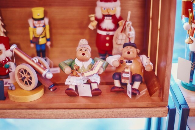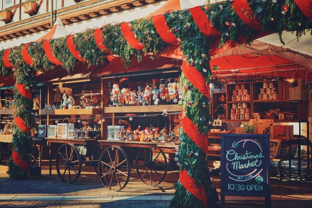 ヒノキの葉と赤いリボンで覆われたかわいいテントが並ぶマーケットには、本場ドイツのクリスマスオーナメント(錫製・木製)やアドベントカレンダー、くるみ割り人形、煙出し人形、鳩時計などドイツの工芸品がずらり。