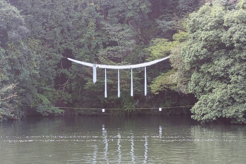 湖上に浮かぶ白いしめ縄は、縁結びや子宝のご利益があるといわれる“湖の神様”。