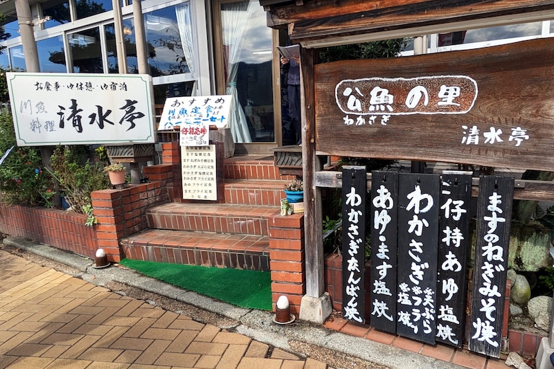 ボートを降りたあとは、湖畔の和食処「清水亭」へ。気さくでチャーミングなご夫婦が営む、旅館併設の食事処です。