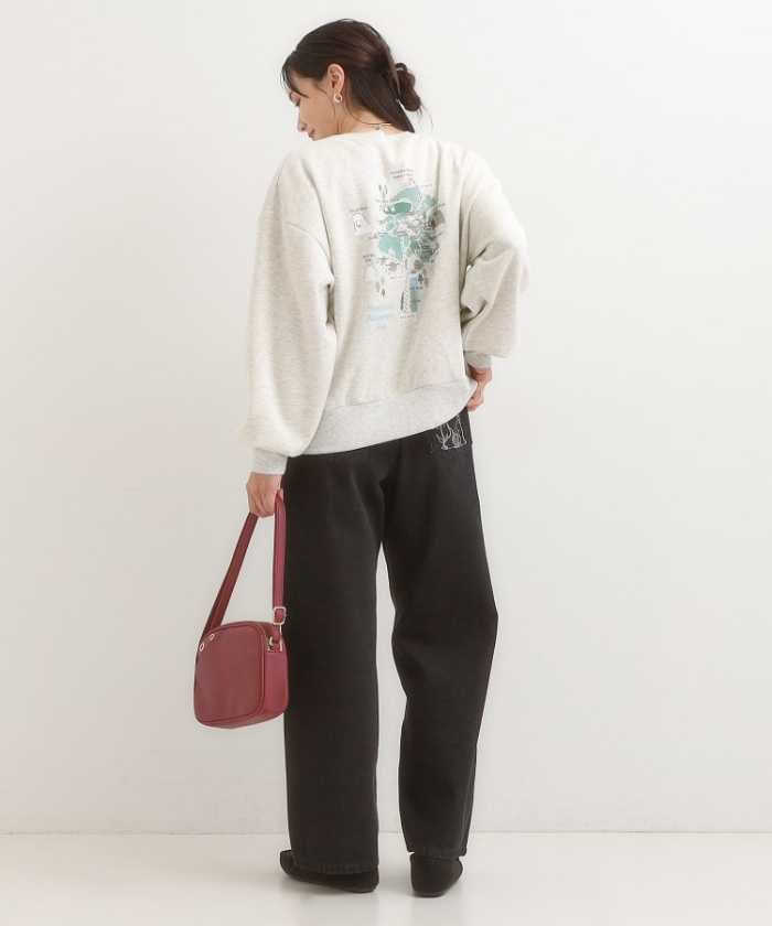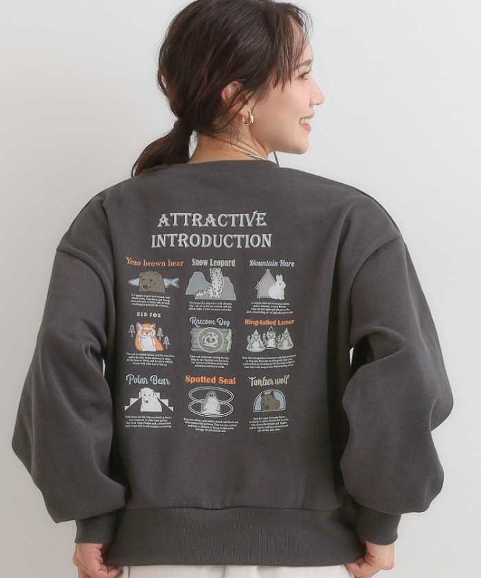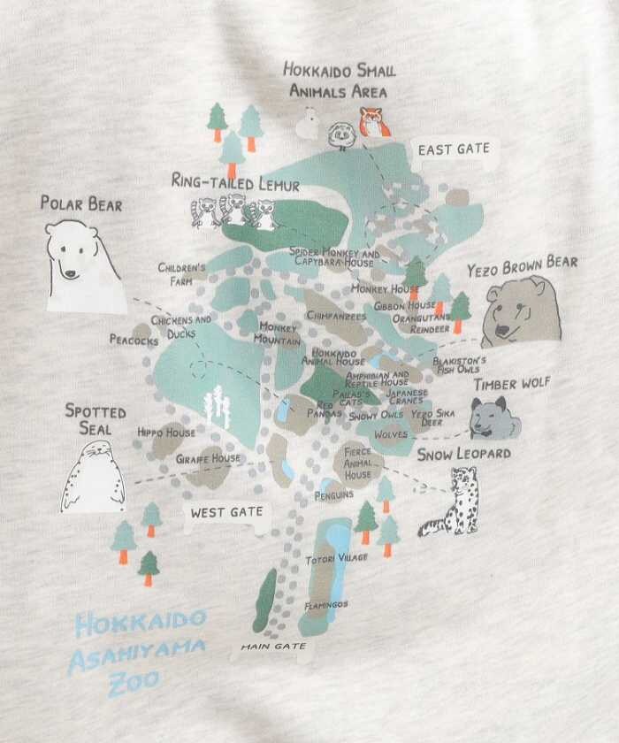 園内MAP風や動物図鑑風デザインをプリントしたスウェット。アイボリー/チャコールグレー、S~LLサイズ展開。軽くて暖かい裏起毛素材で冬も快適。