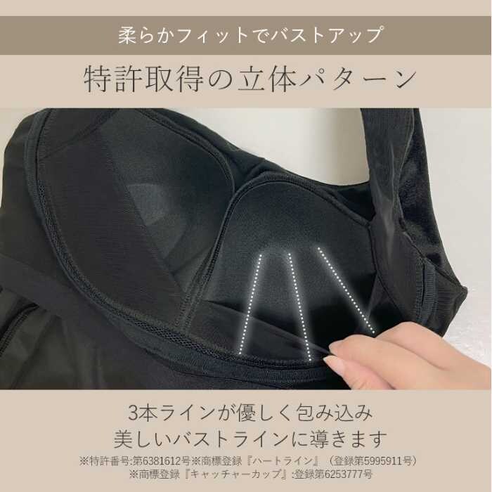 アウターライクに着られるほど高級感があり、1枚でもサマになるデザインです。特許取得の立体パターン(特許番号:6381612号)を採用し、ノンワイヤーながら丸みのある美バストを実現。