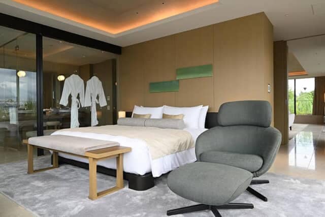 増築棟にある「パノラミックスイート」は京都のパノラマビューを満喫できるシグネチャースイートです。東山の高台からの眺望は素晴らしく、南は京都駅周辺から北の山々まで見渡せるほか、すぐ目の前には清水のランドマークとして有名な八坂の塔が立っています。室内はリビングダイニングとベッドルーム、広いバスルームを備えます。