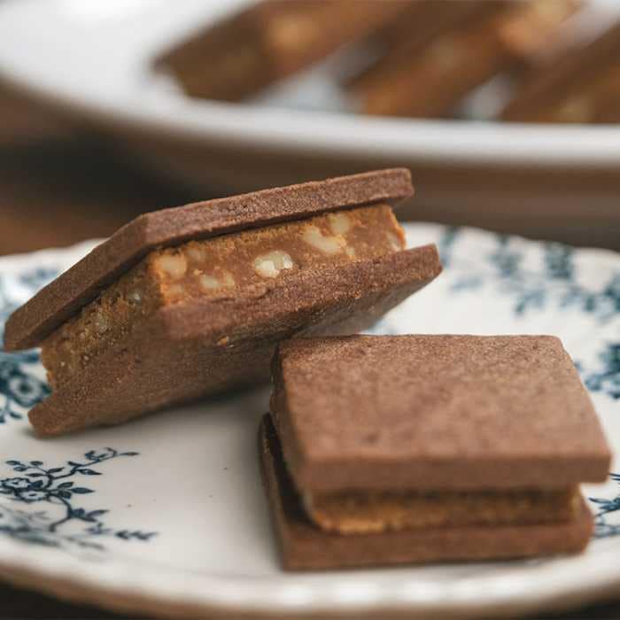 スナックミーの『ココアとくるみのキャラメルナッツサンド』は、キャラメルヌガーの煮詰め具合を絶妙にコントロールし、ねっちりとしないサクッと歯切れの良いキャラメルに仕上げたのが特徴。