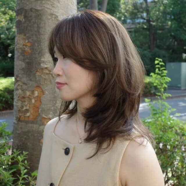 顔まわりにレイヤーを入れたミディアムは、大人世代に人気急上昇中。軽やかさを与えることで、自然な小顔効果とシャープな印象を演出できます。