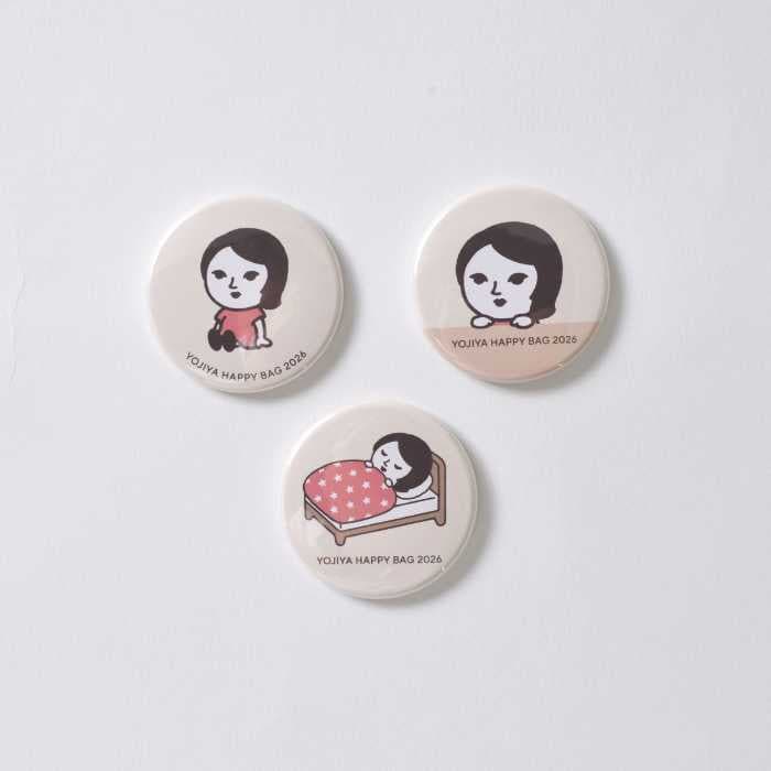 缶バッジは3種類の中からランダム1点が入っており、どれが当たるかは開けてからのお楽しみ♪バッグには、2025年に誕生した新キャラクター「よじこ」がデザインされていて、日常使いにもぴったりの可愛さです。