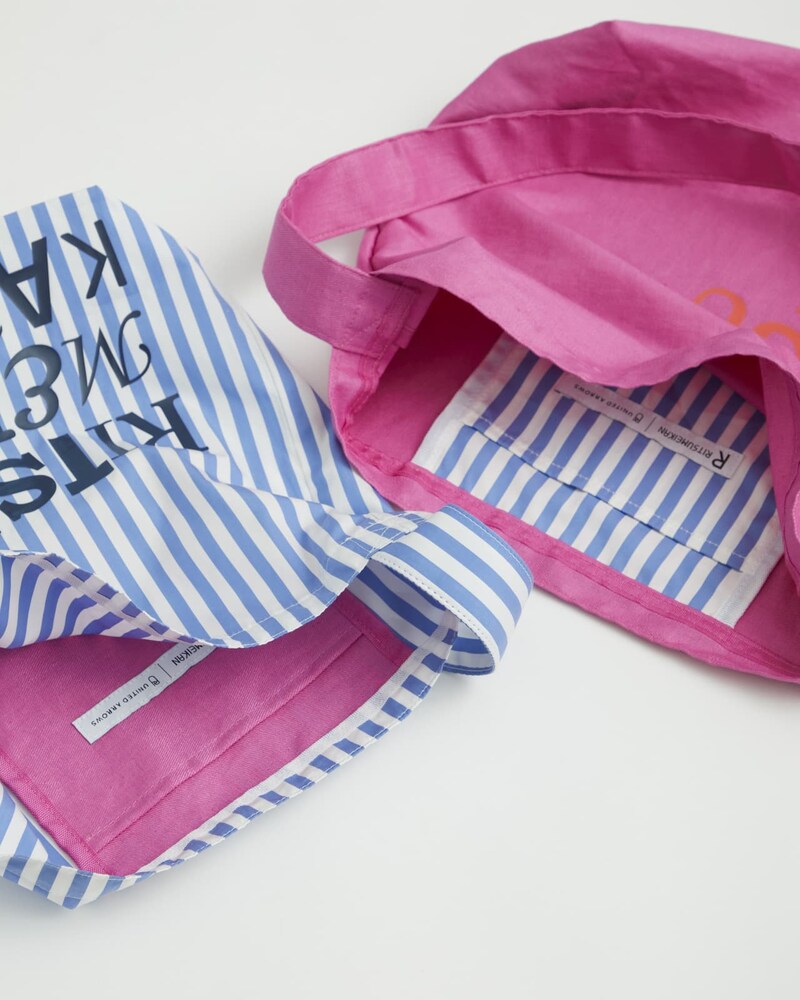 英国の高級シャツメーカーの余剰生地を利用して制作したバッグは、自転車通学者に配慮して肩からの斜め掛けできるように肩ひもを長めに設定。ブルーストライプとピンクで本体色と内ポケットのカラーが逆になっているのもポイントです。