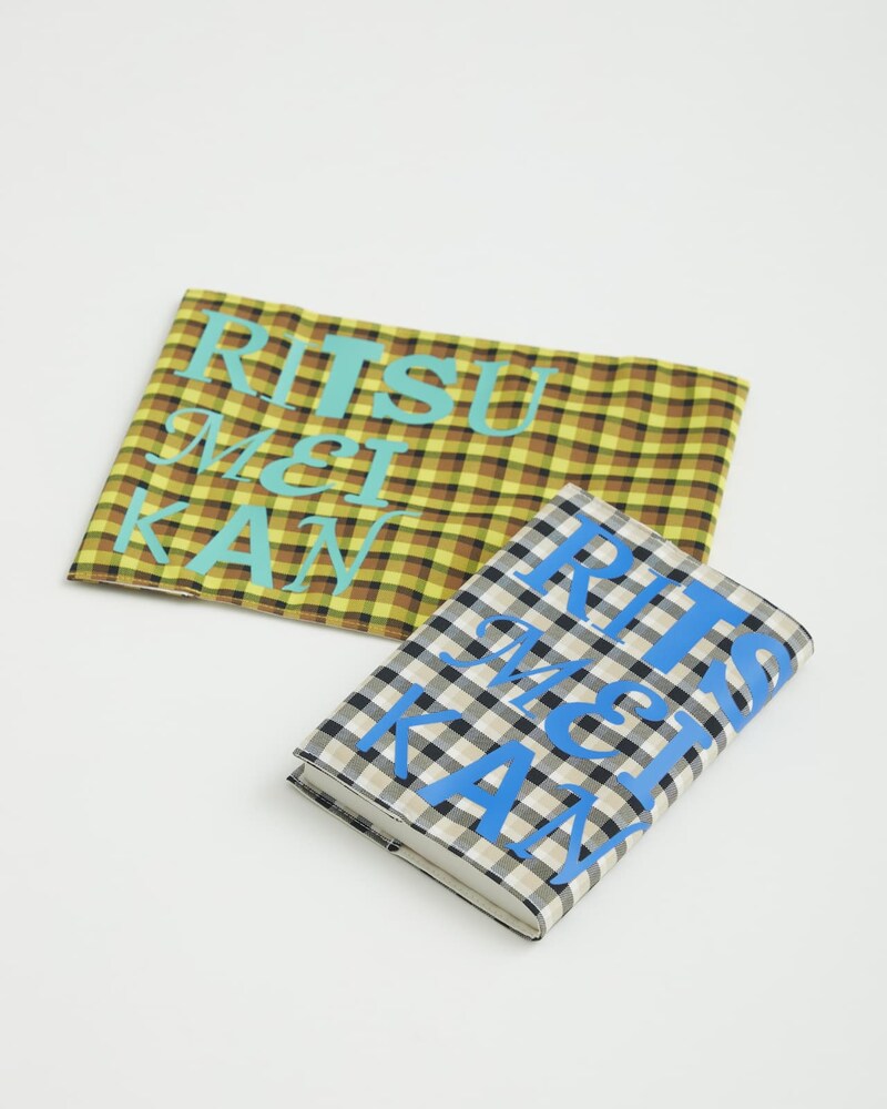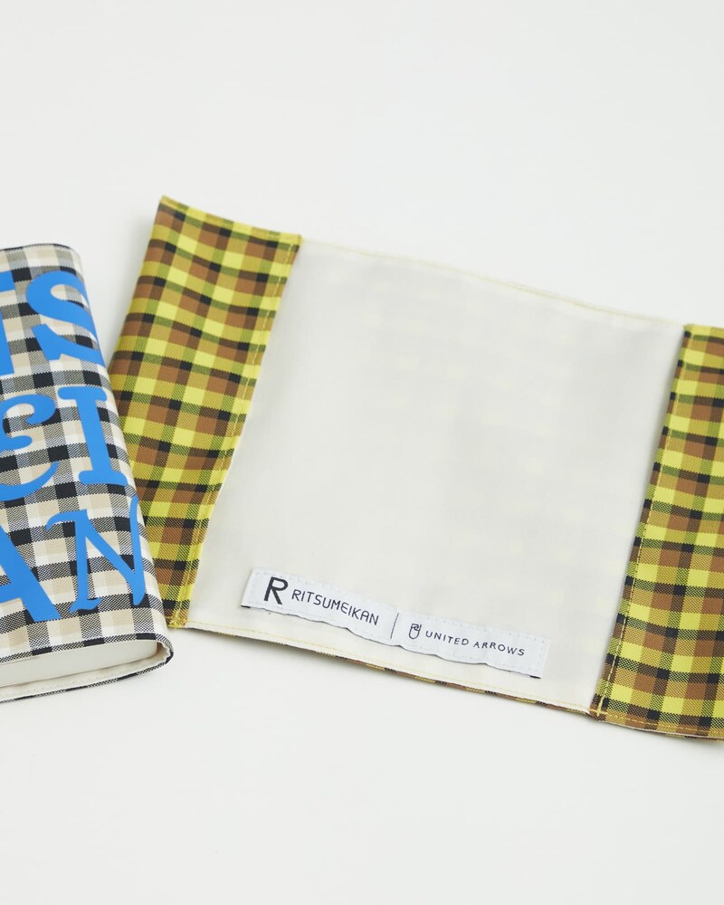 「RITSUMEIKAN」の文字を厚塗りのシルクスクリーンで表現したブックカバーは、文字色をブルーとライトグリーンの2色で展開。“洋服仕様”でブックカバーとしては珍しい裏地付きになっています。