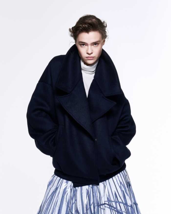 ショートブルゾン(96,800円)はビッグカラーとコクーンシルエットが特徴で、パンツにもスカートにも合わせやすいバランスが魅力。