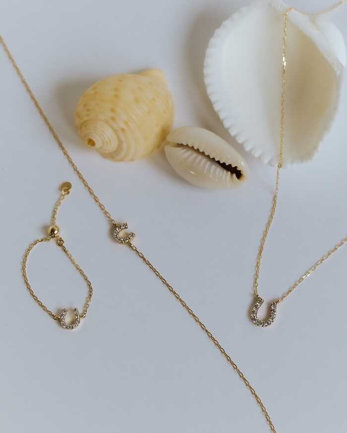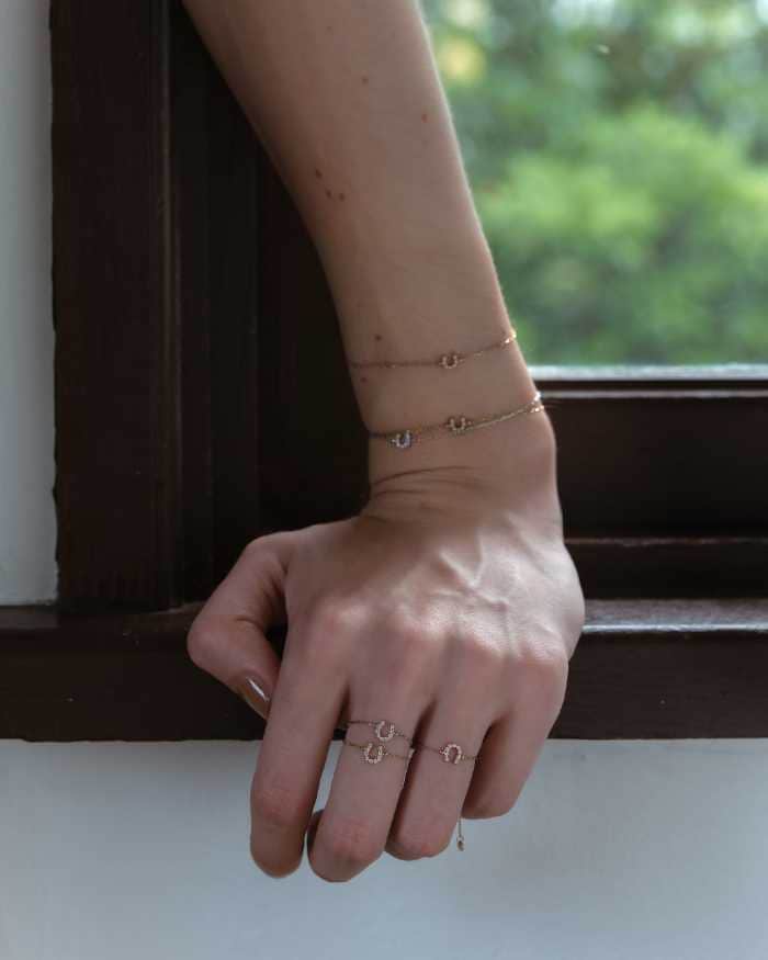馬蹄モチーフのチェーンリングやブレスレットは、幸運を呼ぶお守りとして人気のデザイン。9石のダイヤモンドが輝き、新しい年の始まりにもぴったりのアイテムです。