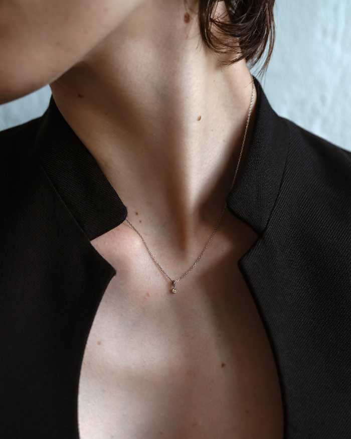 流線ラインが美しいネックレスは、1粒のダイヤモンドが肌の上で繊細に輝く上品なデザイン。