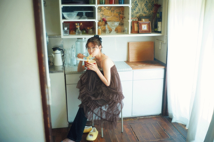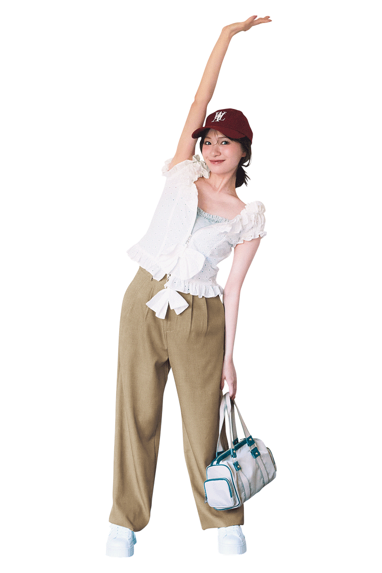 フリルたっぷりのキャミ×ブラウスも、落ちついた色のキャップやパンツとあわせることで甘くなりすぎない!足元はブラウスの色を拾ったスニーカーが正解◎。