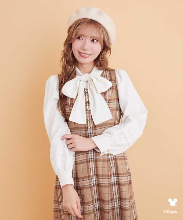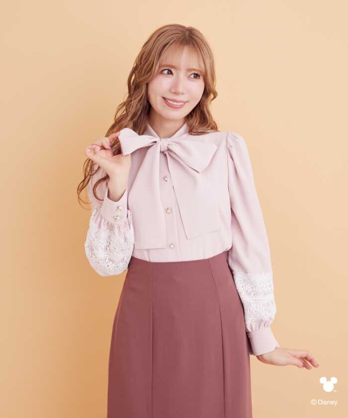 クラシカルな雰囲気が漂う「ボウタイブラウス」(11,000円税込)は、太めのコットンレースを袖口にあしらい、ミッキーシェイプのパールボタンで遊び心をプラス。