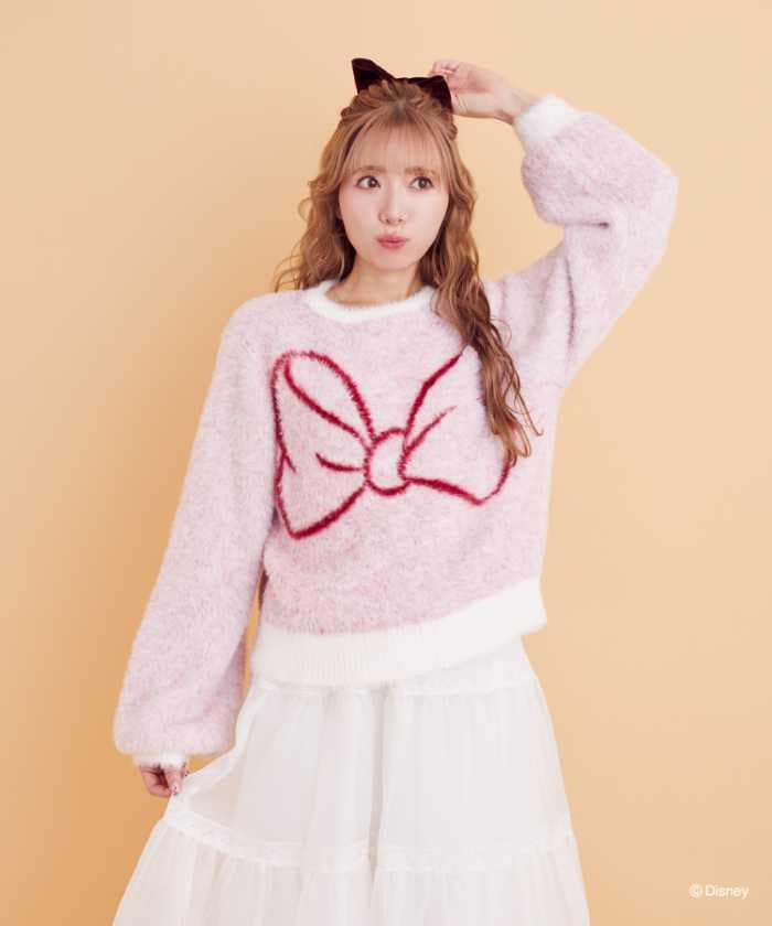 中でも「ミニーマウス」の手書き風サインとリボンを前後に施したフェザーニットプルオーバー(11,900円税込)は、まるで雪のように柔らかい質感が魅力♡