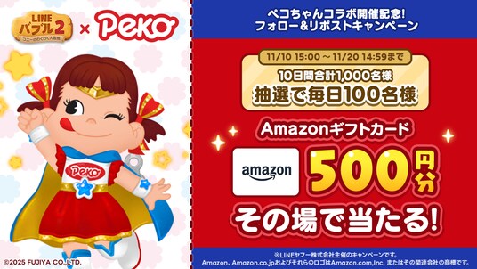 LINEヤフー株式会社は、本日2025年11月10日(月)より、当社が展開するバブルシューティングゲーム「LINE バブル2」(iPhone・Android対応/無料)において、不二家の人気キャラクター『ペコちゃん』とのコラボレーションを開始します。