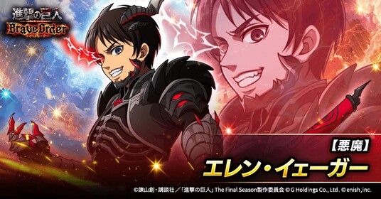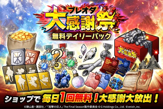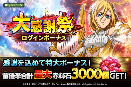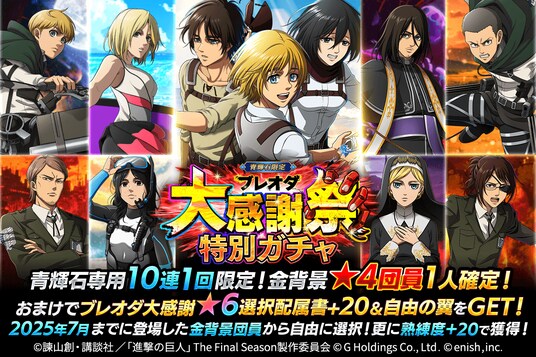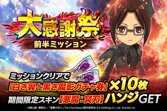 株式会社enish(本社:東京都港区、代表取締役社長:安徳 孝平、以下enish)は、アニメ『進撃の巨人』のスマートフォンゲーム最新作「進撃の巨人Brave Order」にて、2025年11月10日(月)より、ブレオダ大感謝祭を開催!今ならガチャなどに使用できる赤輝石が最大3,000個もらえちゃう!また大感謝祭前半ミッションではハンジの特別な衣装、白き翼と黒き魔影イベントでは育成素材の熟練技能書が最大300個がGET可能!その他、最新情報はゲーム公式サイト・ゲーム公式X(旧Twitter)アカウントにて随時公開して行きますので、ぜひご覧ください。