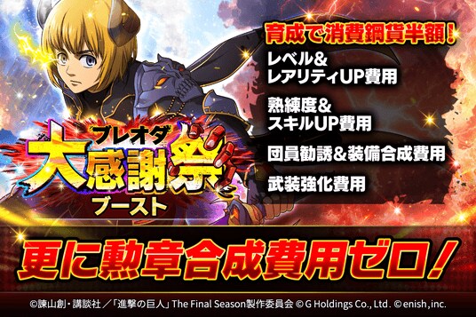 2025年11月10日(月)より、団員のLvアップやレアリティーアップなどの育成費用が半額になる、更に勲章合成費用ゼロとなる大感謝祭ブーストを開催!この機会に団員を強化し強敵に挑もう!