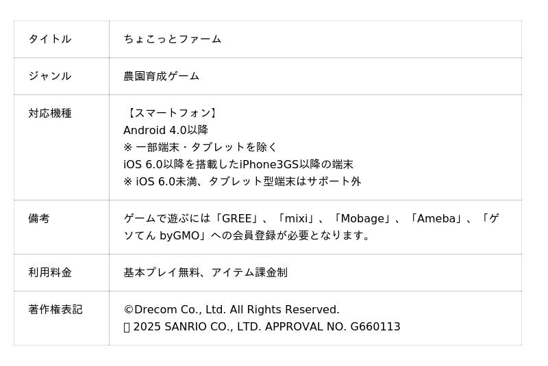 株式会社ドリコム(本社: 東京都品川区、代表取締役社長: 内藤裕紀)は、農園育成ソーシャルゲーム『ちょこっとファーム』において、株式会社サンリオ(本社: 東京都品川区、以下サンリオ)のキャラクターたちと、2025年11月10日(月)より期間限定コラボキャンペーンを開催することをお知らせします。