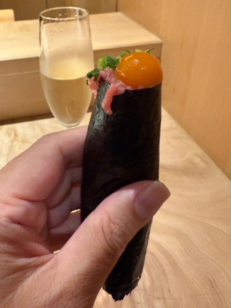 最初に登場したのは、ネギトロにうずらの卵黄をちょこんと落とした巻物。とろりとした黄身とネギトロ、インスタ映えもしそうである。