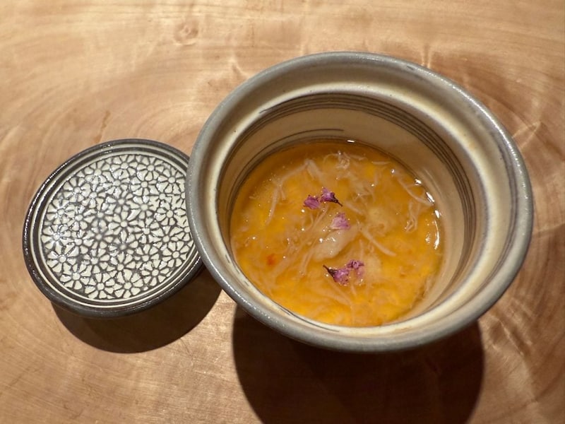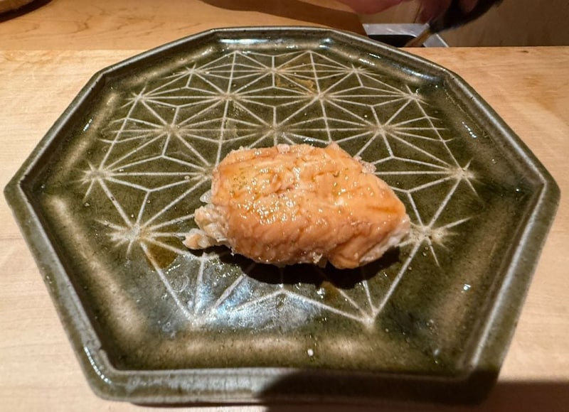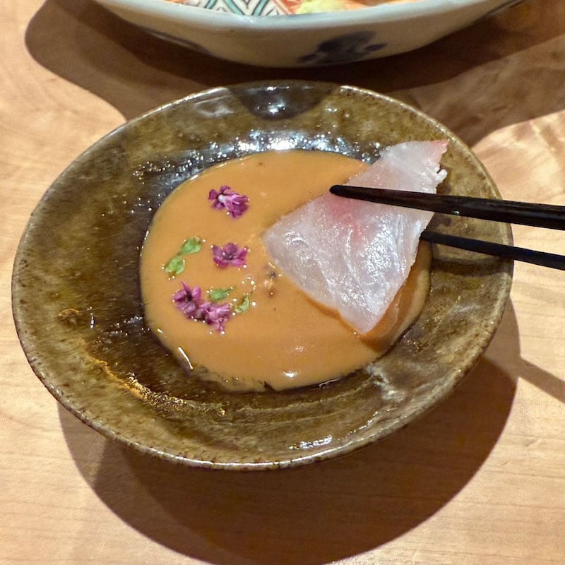 もずくの酢の物の後に、コショウダイとホタテがアンキモ醤油とともに登場。お造りをいただいた後は、皿に残った醤油に酢飯を絡めて味わう。