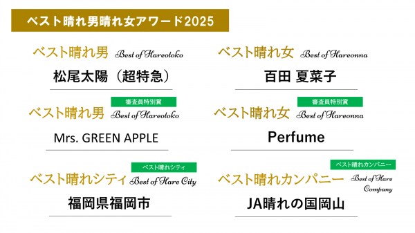 審査員特別賞では、主催の全日本晴れ男晴れ女協会が「Mrs. GREEN APPLE」と「Perfume」が選出され、ベスト晴れシティに「福岡県 福岡市」、ベスト晴れカンパニーに「JA晴れの国岡山」が選出されました。