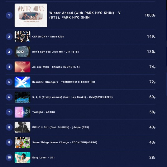 『K-STAR CHART presents POP-K TOP10 Friday』の週間チャートで、1位に輝いたのはBTSのVとPARK HYOSHINによる「Winter Ahead (with PARK HYOSHIN)」でした。番組内でも同楽曲がオンエアされました。