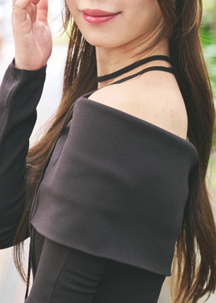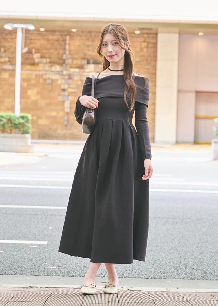 「オフショルワンピはLa luneで約23,000円。大人っぽい黒のロング丈ワンピースにデコルテを大胆に見せて女みをアピール!