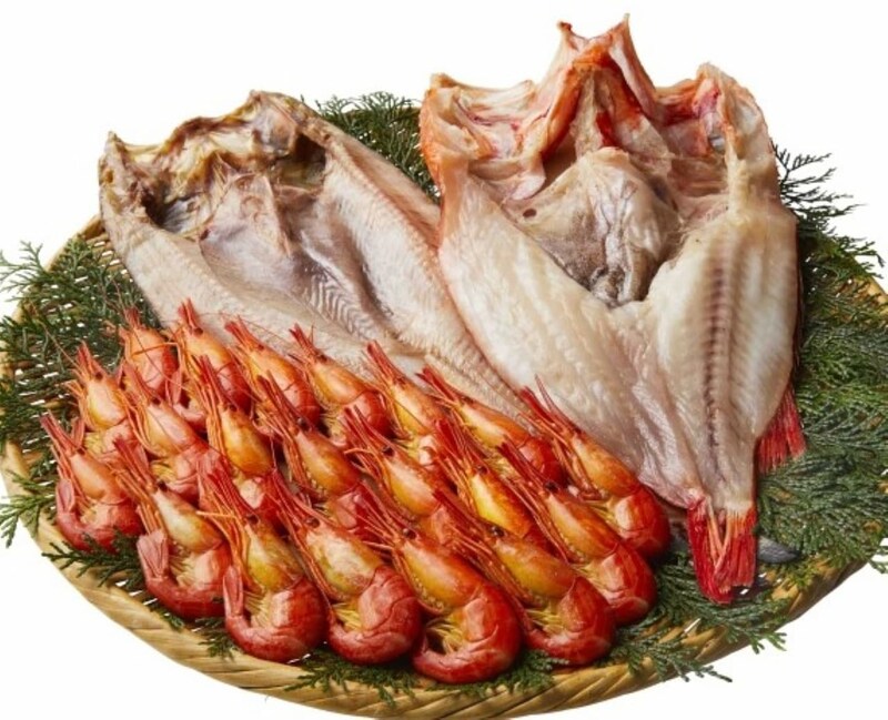 北見「古谷商店」の「北海縞えび」(250g/4,320円)、「きんき開き」(1尾/5,400円)、「真ほっけ開き」(1尾/1,944円)